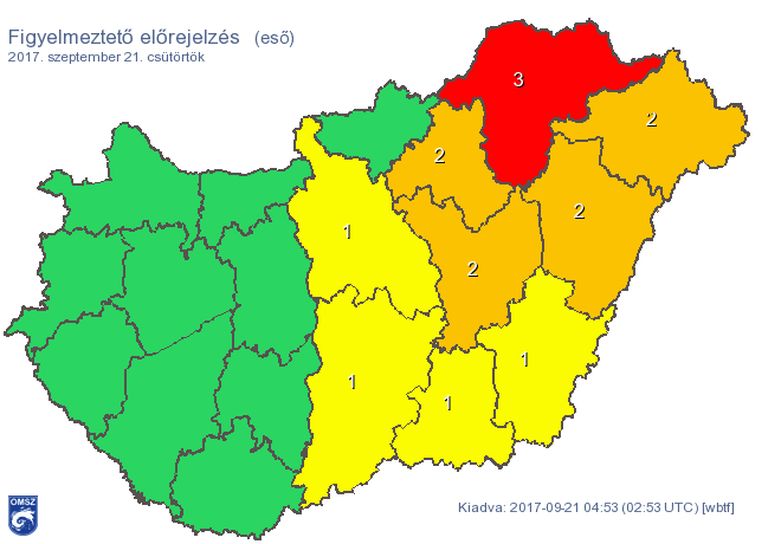 Az Országos Meteorológiai Szolgálat veszélyjelzése szerint az ország keleti felén nagy területen (főként az Északi-középhegység keleti részén és a Tiszántúlon) várható 20-40 milliméternél több csapadék, nem egy helyen akár 50-60 millimétert meghaladó mennyiségű eső is eshet.