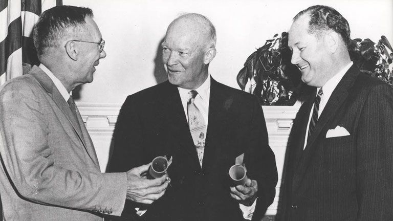 Dwight D. Eisenhower elnök (középen) átadja a NASA első főigazgatója, dr. T. Keith Glennan (j.) és helyettese, dr. Hugh L. Dryden (b.) megbízólevelét 1958. július 29-én (Fotó: NASA)