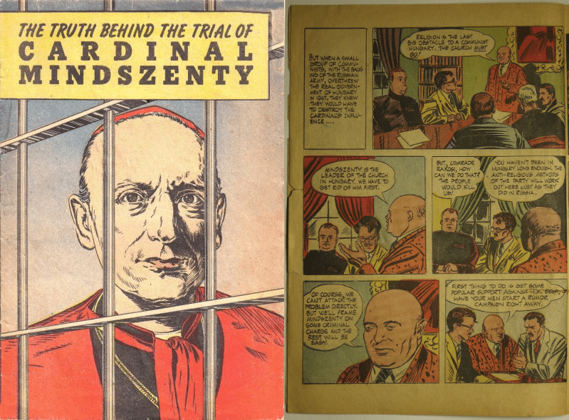 Ám a képregényipar még a filmeseknél is gyorsabban kapcsolt. A minnesotai Saint Paulban működő Catechetical Guild Educational Society, ami keresztény és antikommunista képregények gyártásával foglalkozott 1942-től 1972-ig, és főleg az amerikai egyházi iskolák tanulóit célozta kiadványaival, már 1949-ben, Az igazság Mindszenty bíboros tárgyalása mögött c. füzetkéjében feldolgozta a bíboros kirakatperét. Az interneten fellelhető néhány részlet alapján a képregény maximálisan megfelel a kor esztétikai elvárásainak, a Supermen-univerzum golyófejű főgonoszára, Lex Luthorra meglehetősen emlékeztető Rákosi Mátyás például egyenesen telitalálat, ahogy azt mennydörgi, hogy A vallás az utolsó gát, ami a kommunista Magyarország megvalósulása előtt áll. Az egyháznak el kell tűnnie! Ráadásul kicsit olyan, mintha a főtitkár elvtárs egy feltűnő, narancssárga alapon leopárdmintás zakót viselne, ami egészen új fényben tünteti fel a háború utáni Magyarország öltözködési kultúráját.