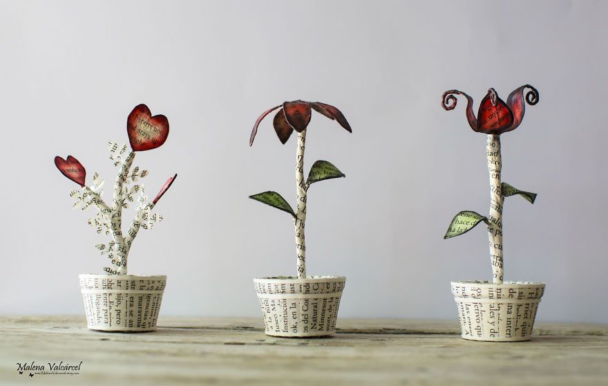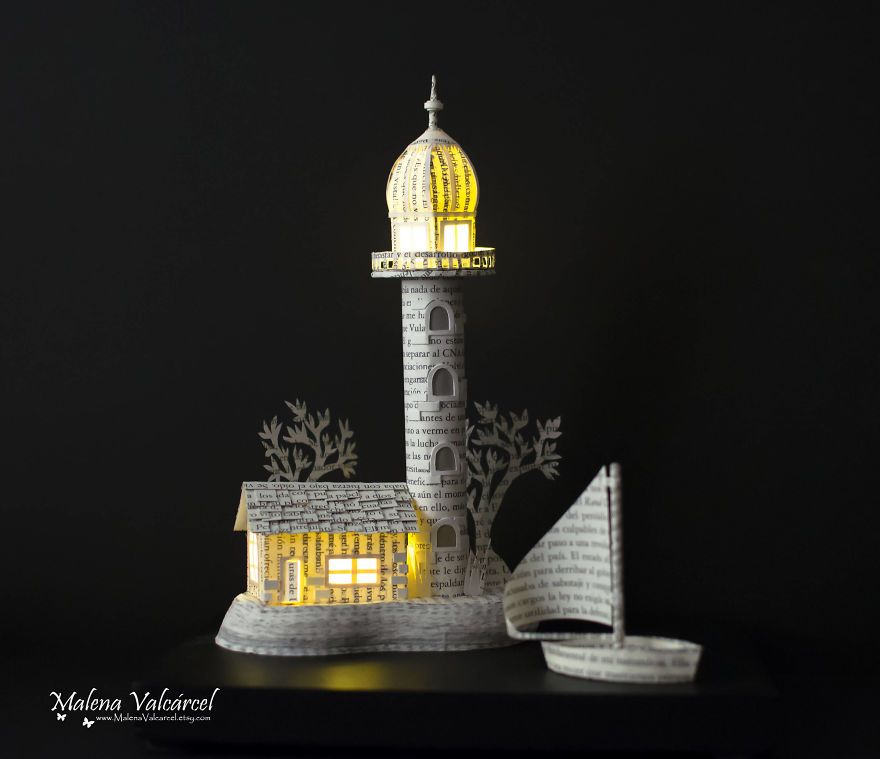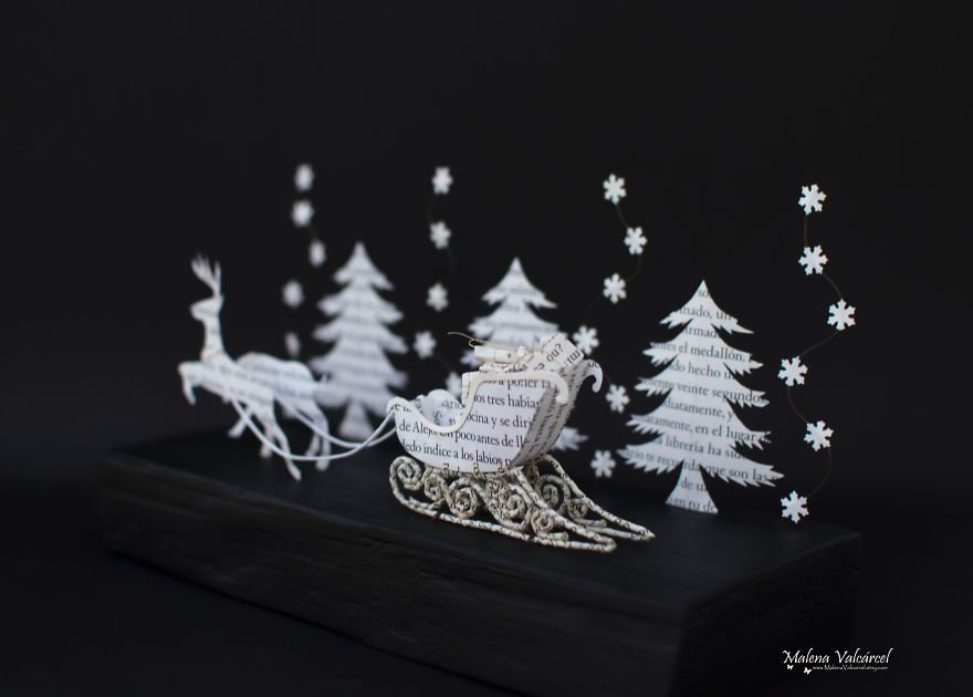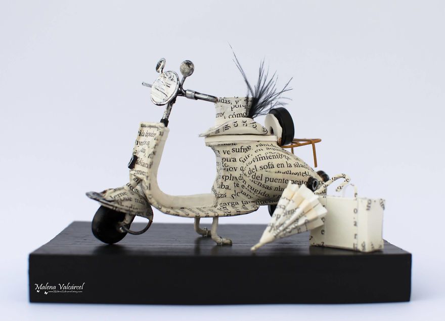 Legtöbbször finom, részletesen kidolgozott madarakat vagy bájos házikókat alkot, de csinált már parányi könyvespolcot és apró gramofont is papírból. A spanyol művész alkotásait az teszi még inkább különlegessé, hogy a „szobrokat” nem üres lapokból, hanem eldobott könyvek oldalaiból formázza, a szöveg által pedig újabb érdekes dimenziót kapnak ezek az izgalmas kis kincsek.