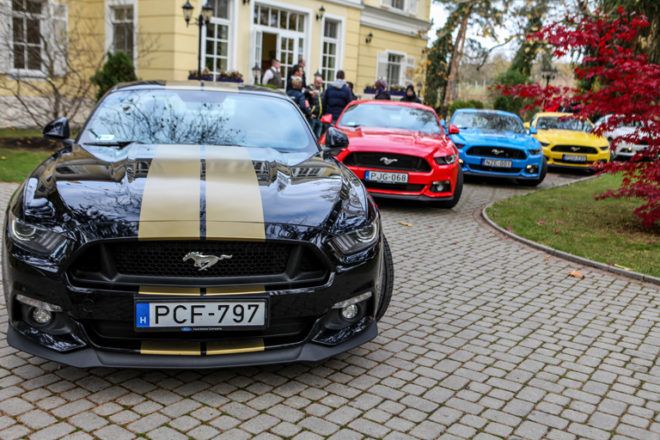 Mustang-csoportkép, az előtérben Kiss Gergely fekete-arany bestiája (Fotó: Ford Magyarország)