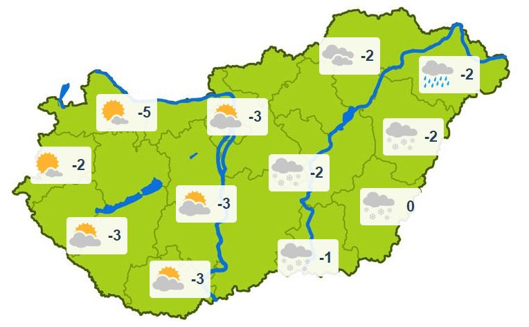 Szombaton az ország nagy részén a köd feloszlása után változóan felhős lesz az ég, de helyenként tartósabban megmarad a köd és az alacsony szintű felhőzet, illetve a Tiszántúlon erősen felhős lesz az ég. A keleti határvidéken helyenként kisebb eső, havas eső, havazás előfordulhat, másutt csapadék nem valószínű. Megélénkül, néhol megerősödik az északi szél – írja a Kiderül.hu.
