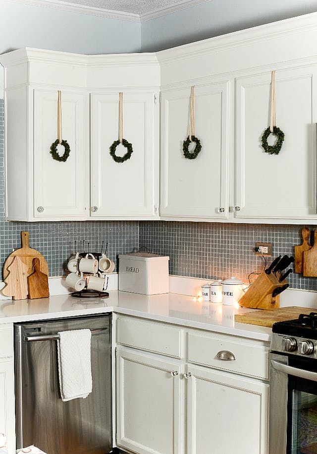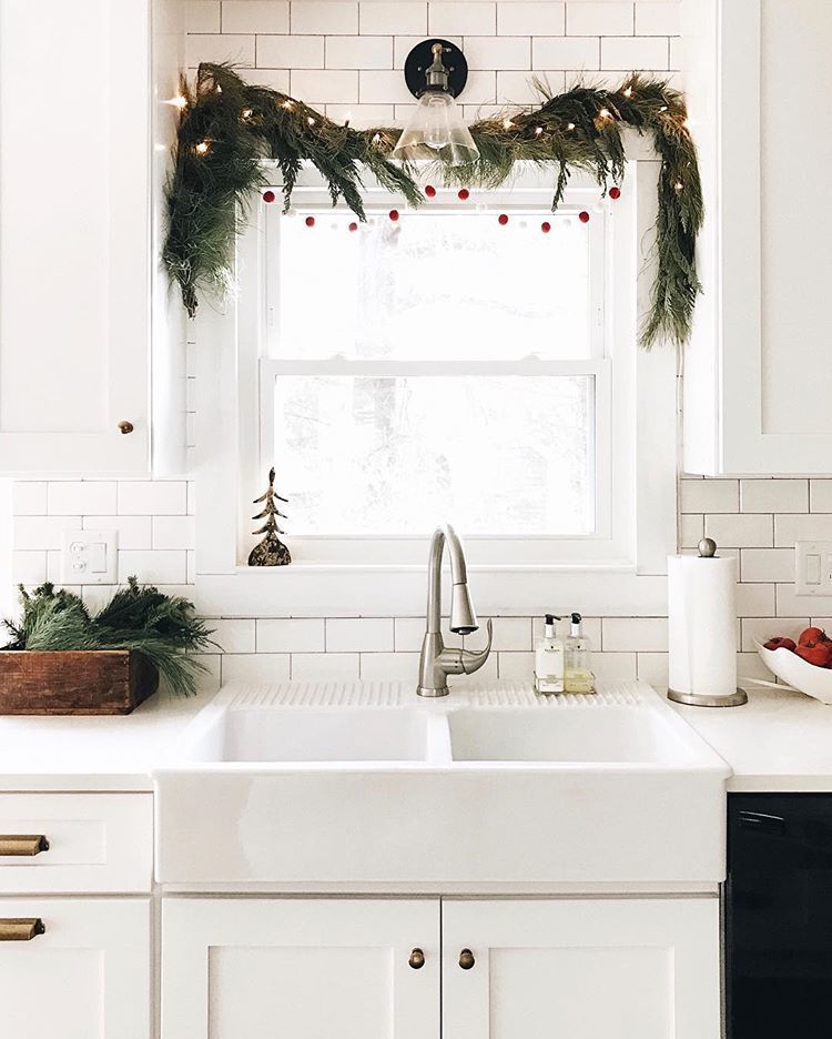 A minikoszorúkból lehet, hogy sok lenne, ha a képen látható módon minden szekrényre lógatnánk, de azért egy-kettőt simán el tudnék képzelni a saját konyhámban. Épp csak jelzésértékűen. Az ablak környéke is adja magát, hogy égősorral vagy fenyőággal feldíszítsük, feltéve persze, hogy nem pont ott van a tűzhely, mert akkor inkább ne gyújtsuk fel az egész lakást a karácsony szellemében.
