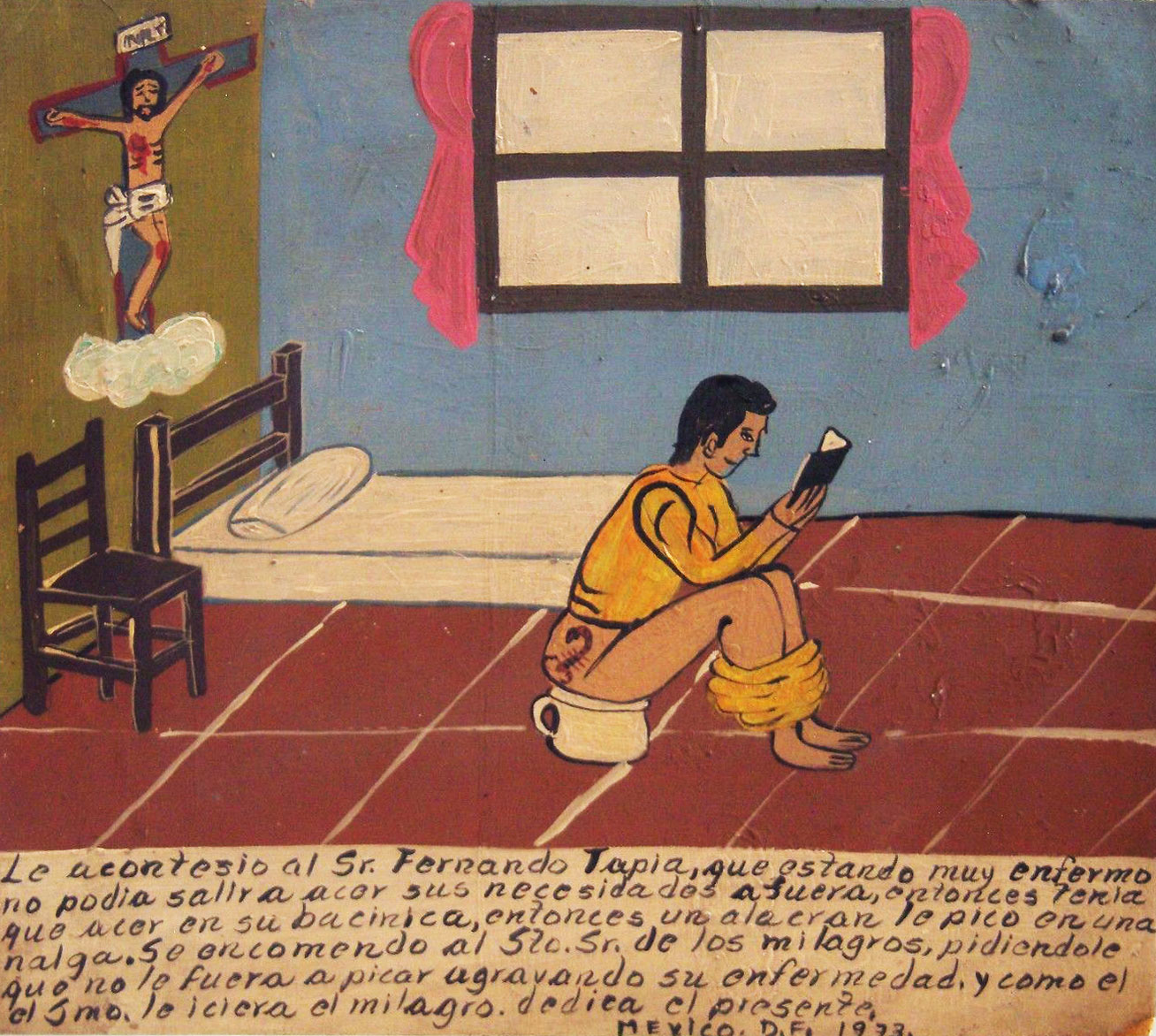Fernando Tapia nagyon beteg volt, és nem tudott elmenni vécére, így az éjjeliedénybe végezte a dolgát. Hirtelen egy skorpió tűnt fel az edényben, és felmászott Fernando farpofájára, de ő a Csodák Urának kegyelmébe ajánlotta magát, hogy a skorpió ne csípje meg, és ne súlyosbodjon az állapota. Az Úr csodát tett, amit Fernando ezzel a retablóval hálál meg. (Mexikóváros, 1977)