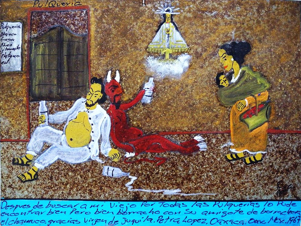 Az összes kocsmában kerestem már a férjemet, mire végül rátaláltam: tökrészegen, ivócimborája, a Sátán társaságában. Köszönöm, Juquilai Szűz. (Oaxaca, 1967)