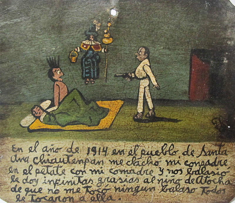 A cimborám rajtakapott a feleségével, és tüzet nyitott ránk. Végtelen hálámat küldöm az Atochai Szent Gyermeknek, mert engem végül nem talált el – az összes golyót a felesége kapta. (1914, Santa Ana Chiautempan)