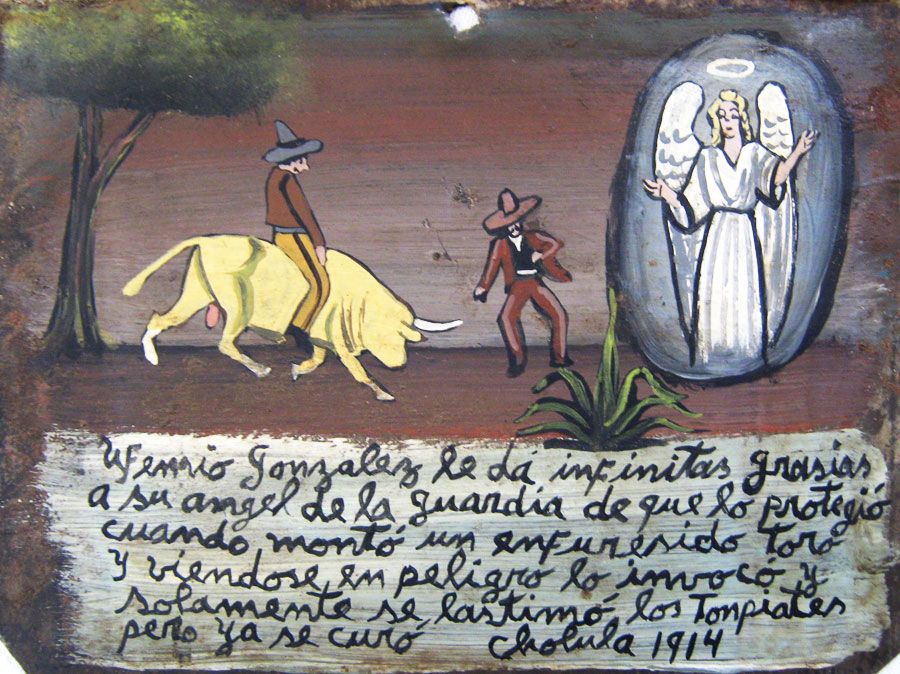Eufimio Gonzalez köszöni az őrangyalának, hogy megoltalmazta, mikor egy vad bikán lovagolt. Amint veszélyben érezte magát, rögtön az angyalhoz imádkozott, így csak a heréit sértette meg. De már azok is rendben vannak. (Cholula, 1914)