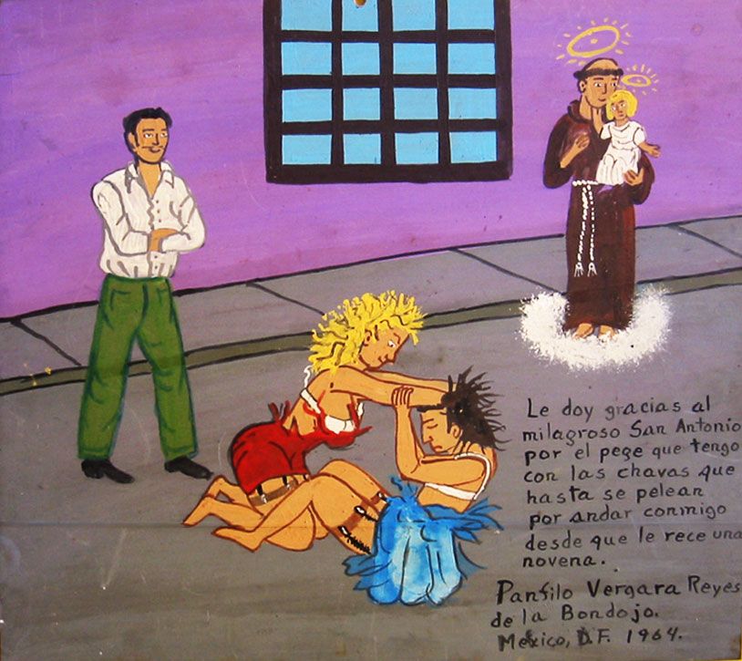 Köszönöm Szent Antalnak, hogy mióta buzgón imádkoztam, olyan hatással vagyok a nőkre, hogy azon is összeverekednek, hogy melyikük mehessen el velem randevúzni (Mexikóváros, 1964)