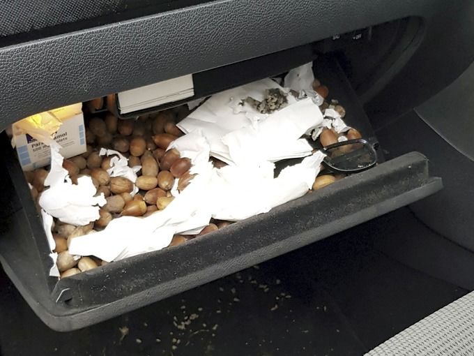 Igencsak meglepődött, hiszen elutazása előtt egyetlen makk sem volt a kesztyűtartóban. Míg ő utazgatott, néhány szorgalmas mókus éléskamrát csinált a járművéből.