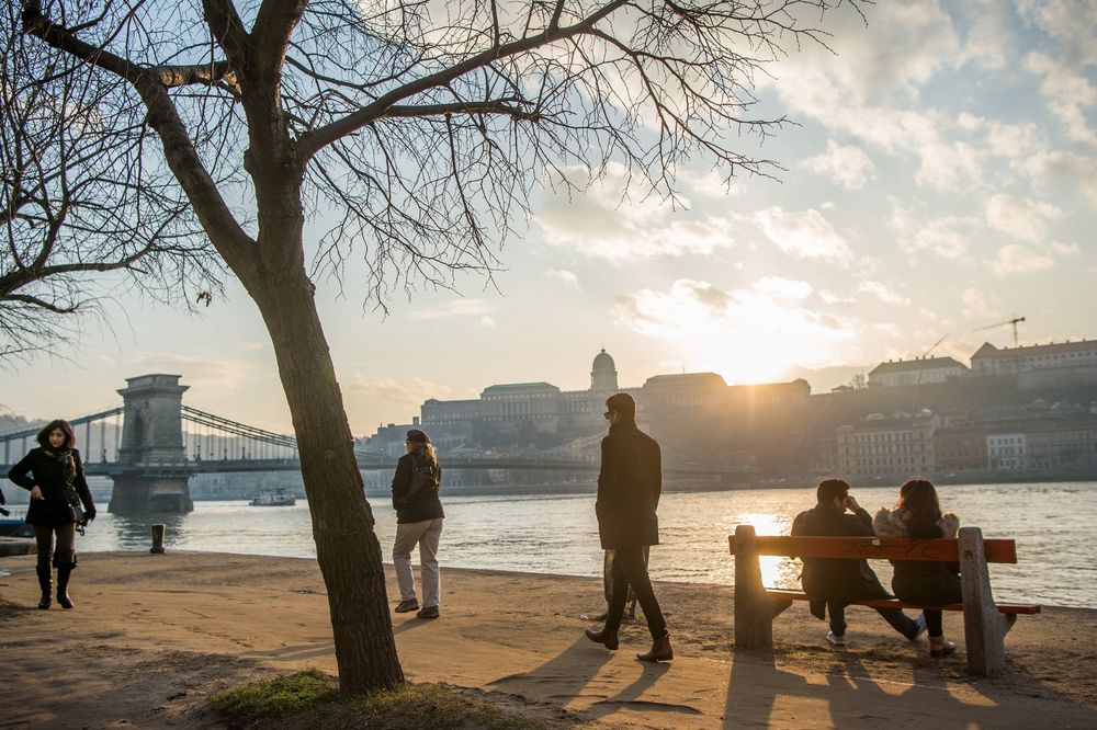 Járókelők a tavaszias időben Budapesten, a idősebb Antall József rakparton (MTI Fotó: Balogh Zoltán)