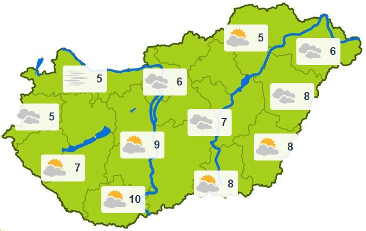Szombaton északon többnyire erősen felhős, párás, helyenként tartósan ködös idő lesz, délen, délkeleten szakadozottabb lesz a felhőzet, ott néhány órára kisüthet a nap. Csapadék nem várható, legfeljebb a ködös helyeken alakulhat ki szitálás. Mérsékelt marad a légmozgás. A legalacsonyabb éjszakai hőmérséklet +3 és -5 fok között valószínű. A legmagasabb nappali hőmérséklet általában 3 és 10 fok között alakul.