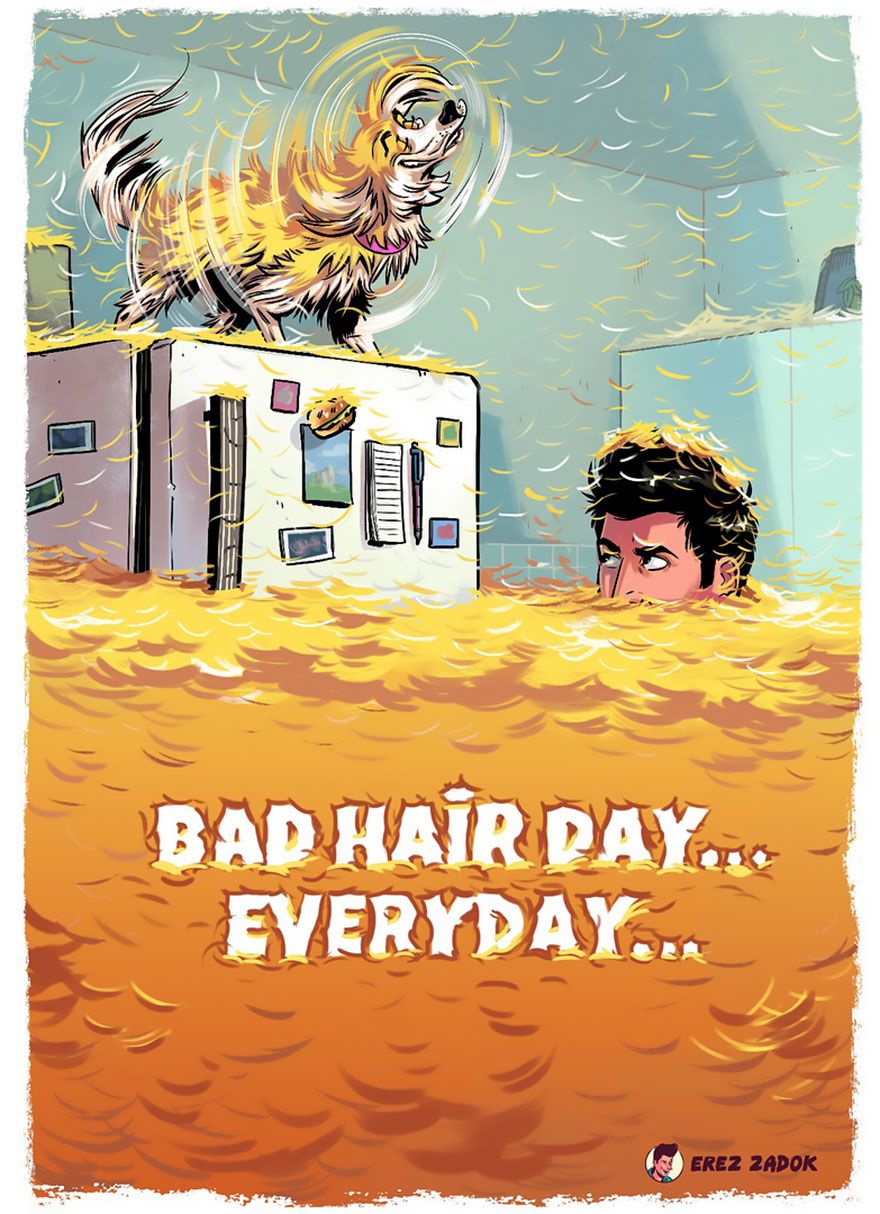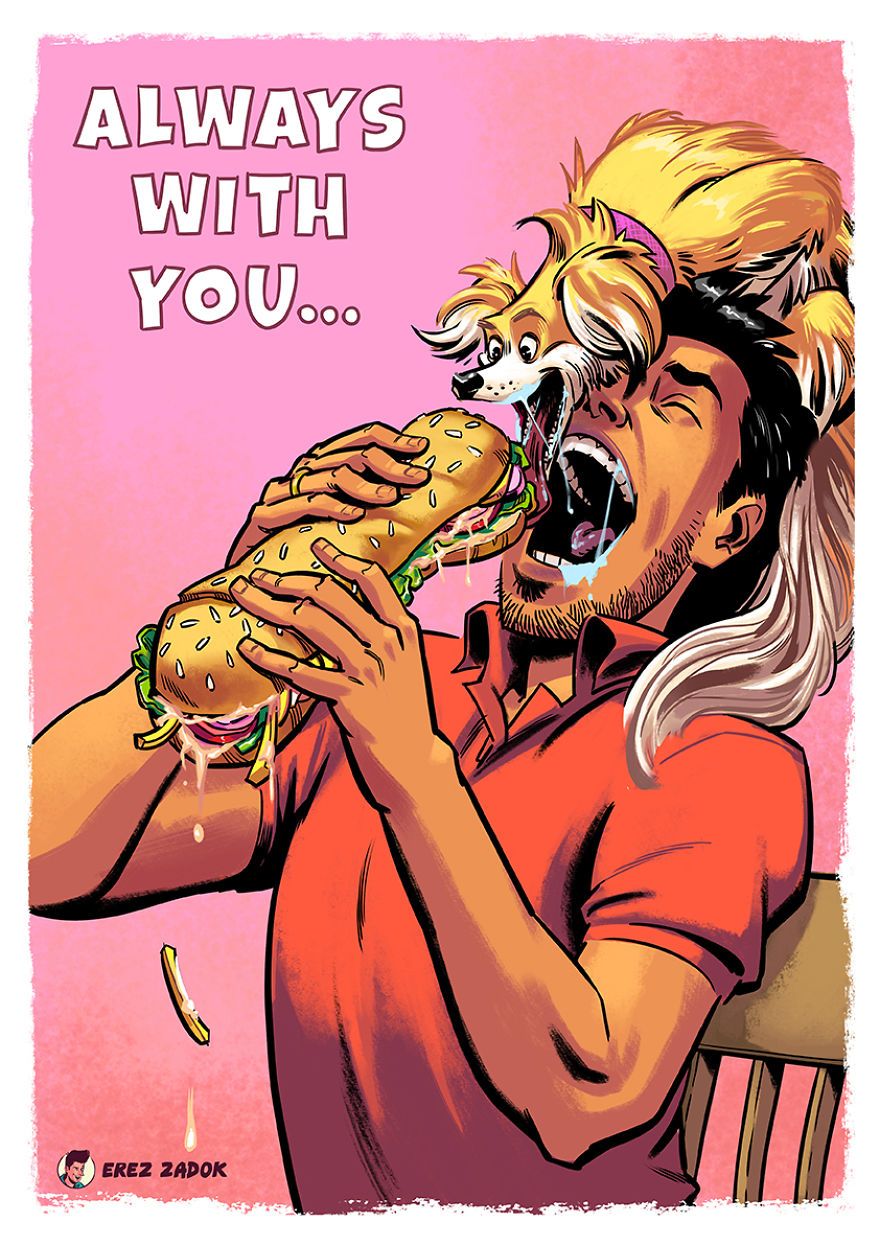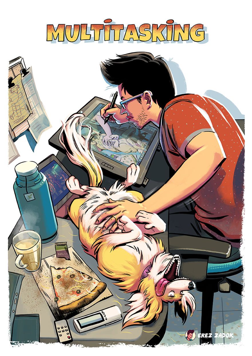 Minden kutyatulajdonos tudja, hogy egy négylábúval együtt élni nem mindig felhőtlen muri. Először is ott van az a rengeteg kutyaszőr, aztán a tény, hogy a kutyád bármikor gátlástalanul áttrappol rajtad, és még akkor is rendíthetetlenül követeli a figyelmed, mikor neked nyilvánvalóan más dolgod lenne. Persze ezek a dolgok tényleg semmit sem számítanak ahhoz képest, hogy mennyi boldogságot adhatnak neked a kutyák. Valami ilyesmit mesél el Erez Zadok illusztrátor is tündéri rajzain.