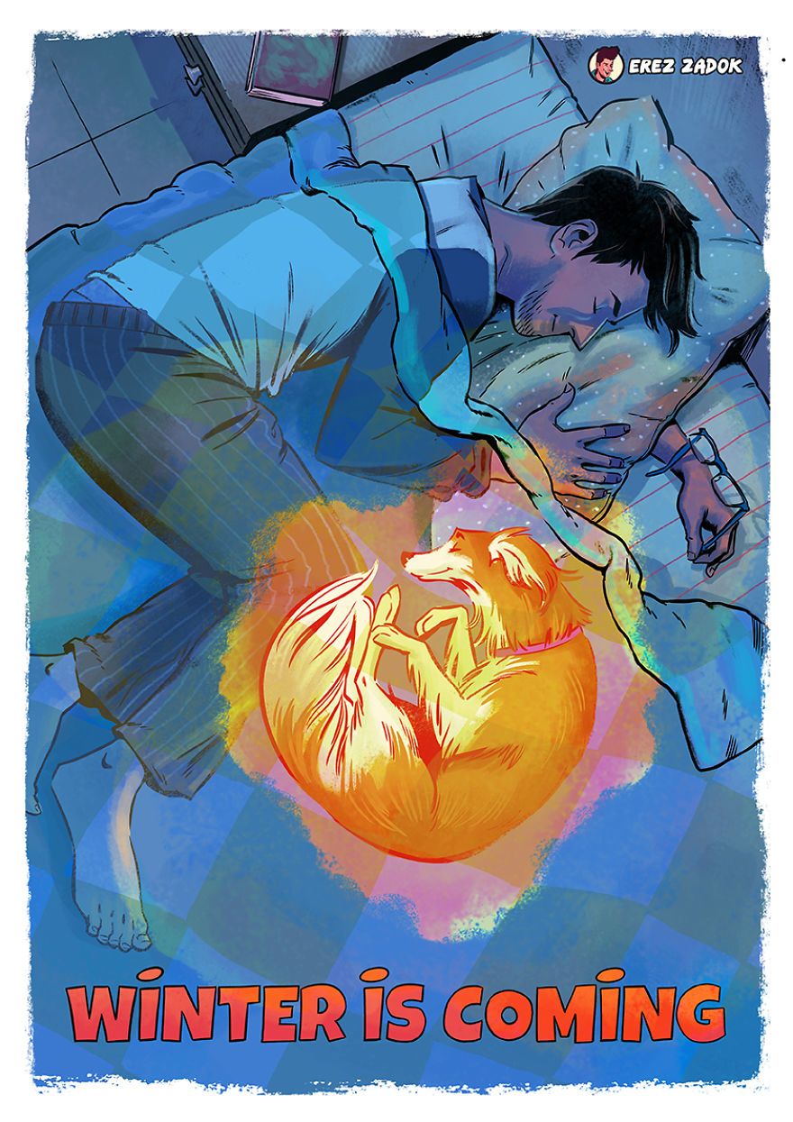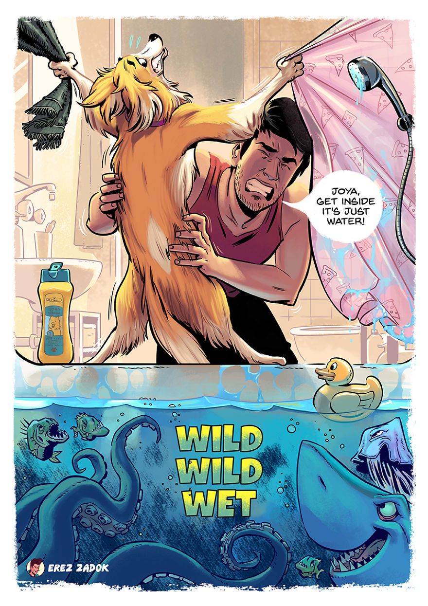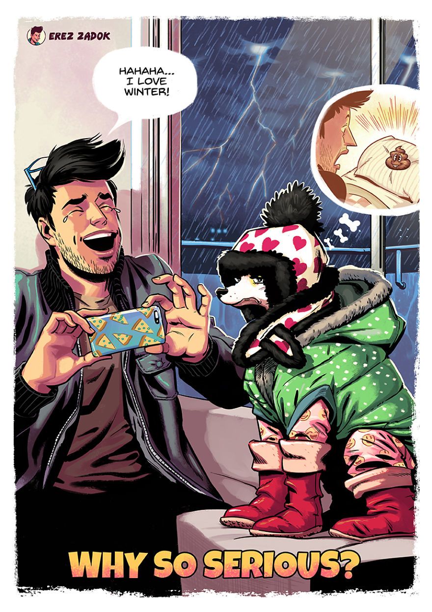 Minden kutyatulajdonos tudja, hogy egy négylábúval együtt élni nem mindig felhőtlen muri. Először is ott van az a rengeteg kutyaszőr, aztán a tény, hogy a kutyád bármikor gátlástalanul áttrappol rajtad, és még akkor is rendíthetetlenül követeli a figyelmed, mikor neked nyilvánvalóan más dolgod lenne. Persze ezek a dolgok tényleg semmit sem számítanak ahhoz képest, hogy mennyi boldogságot adhatnak neked a kutyák. Valami ilyesmit mesél el Erez Zadok illusztrátor is tündéri rajzain.