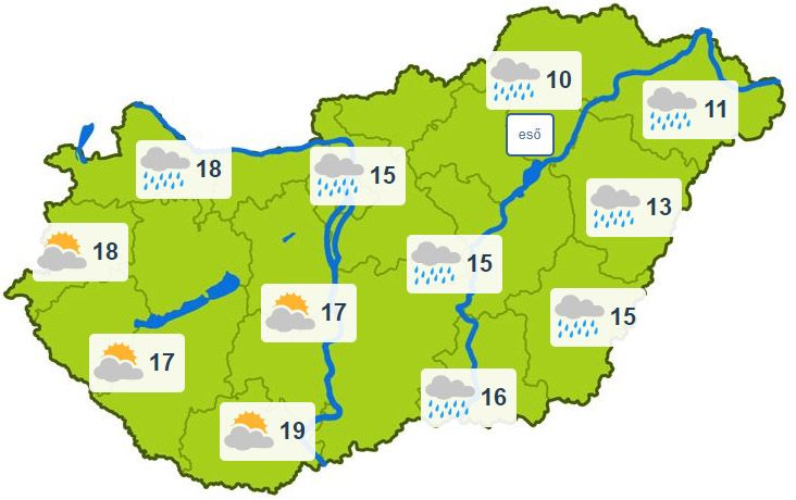 Helyenként, nagyobb eséllyel késő délután, este alakulhat ki eső, zápor. A déli, délkeleti szél napközben többfelé megélénkül, a Dunántúlon megerősödik, a Kisalföldön és az Alpokalján viharossá fokozódik.