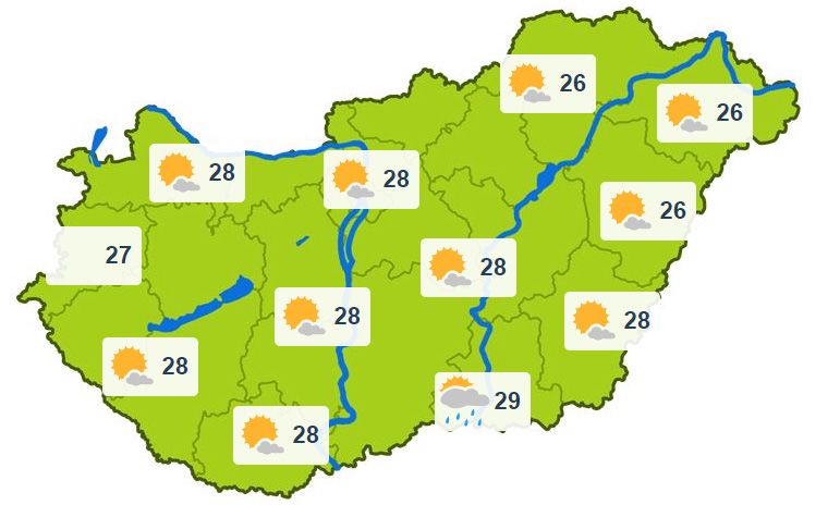 Hétfőn napos idő várható, délután és este lehet helyenként zápor, zivatar. Többfelé élénk, helyenként erős, zivatar környezetében viharos széllökések is lehetnek. A leghidegebb órákban 10-17 fok lehet. Napközben 25-30 fokig melegszik a levegő.
