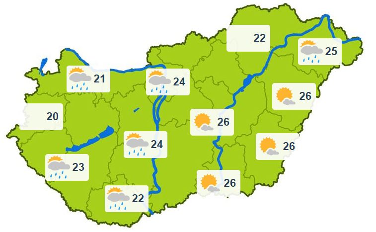 Szerdán többórás napsütés mellett erősen és gyengébben felhős időszakok váltakoznak. Szórványosan várható zápor, zivatar. Délnyugaton mérsékelt marad a légmozgás, másutt többfelé megélénkül a keleti, északkeleti szél, illetve zivatarok környezetében viharos széllökések is lehetnek. A legalacsonyabb éjszakai hőmérséklet 7 és 14, a legmagasabb nappali hőmérséklet 22 és 28 fok között alakul, keleten lesz a melegebb.