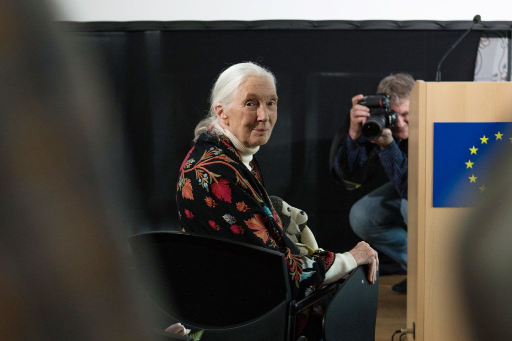 Goodall 2018-as magyarországi útján pedig a személyes dimenzió még a szokásosnál is nagyobb teret kapott, ugyanis amellett, hogy a magyar Jane Goodall Intézet meghívására érkezve avatott tanösvényt, népszerűsítette a fiatalok környezeti nevelését felkaroló Roots & Shoots (Rügyek és Gyökerek) nevű programját, beszélt az ELTE-n, majd az Európa Pont vendégeként tartott előadást és beszélgetett a pálmaolaj, illetve a műanyag hulladék környezetkárosító hatásáról, e programpont záróeseményeként saját konferanszát követően levetítették a National Geographic róla szóló, Jane – Egy élet a csimpánzok között című filmjét is. Mi pedig nemcsak az előadás szép számú közönségében voltunk ott, hanem azon kevesek között is, akik a vetítés alatt válthattak néhány szót személyesen is a tudóssal.