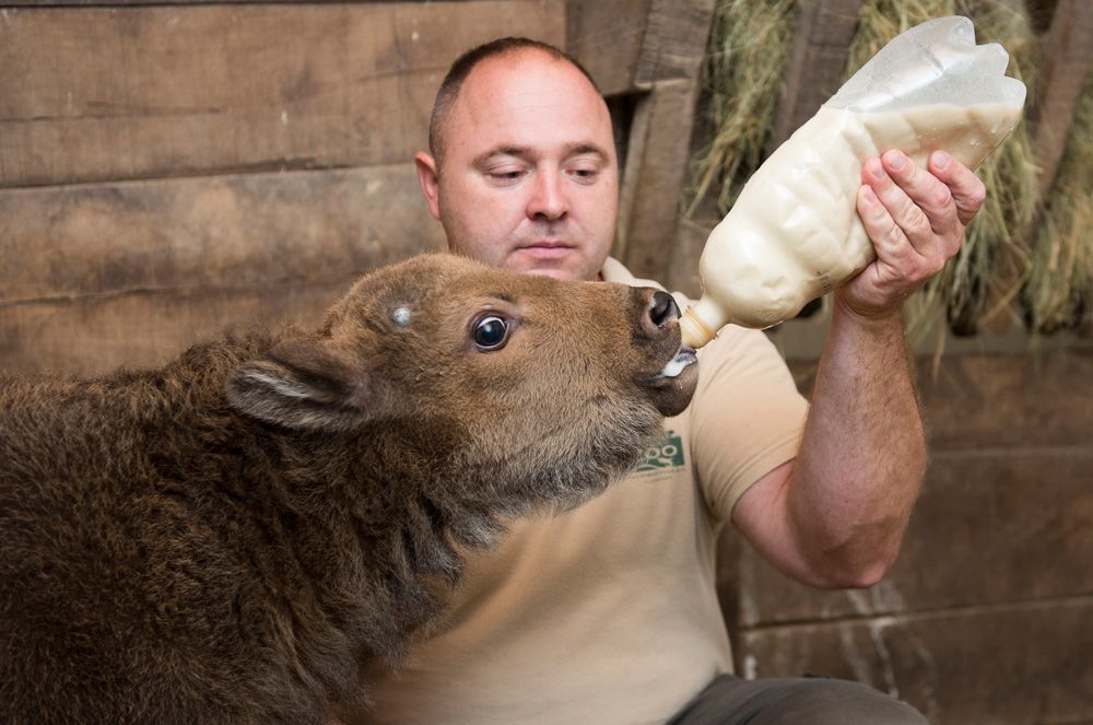 Csergő Árpád, a Nyíregyházi Állatpark vezető gondozója és a cumisüvegből etetett háromhetes európai bölényüsző – MTI Fotó: Balázs Attila