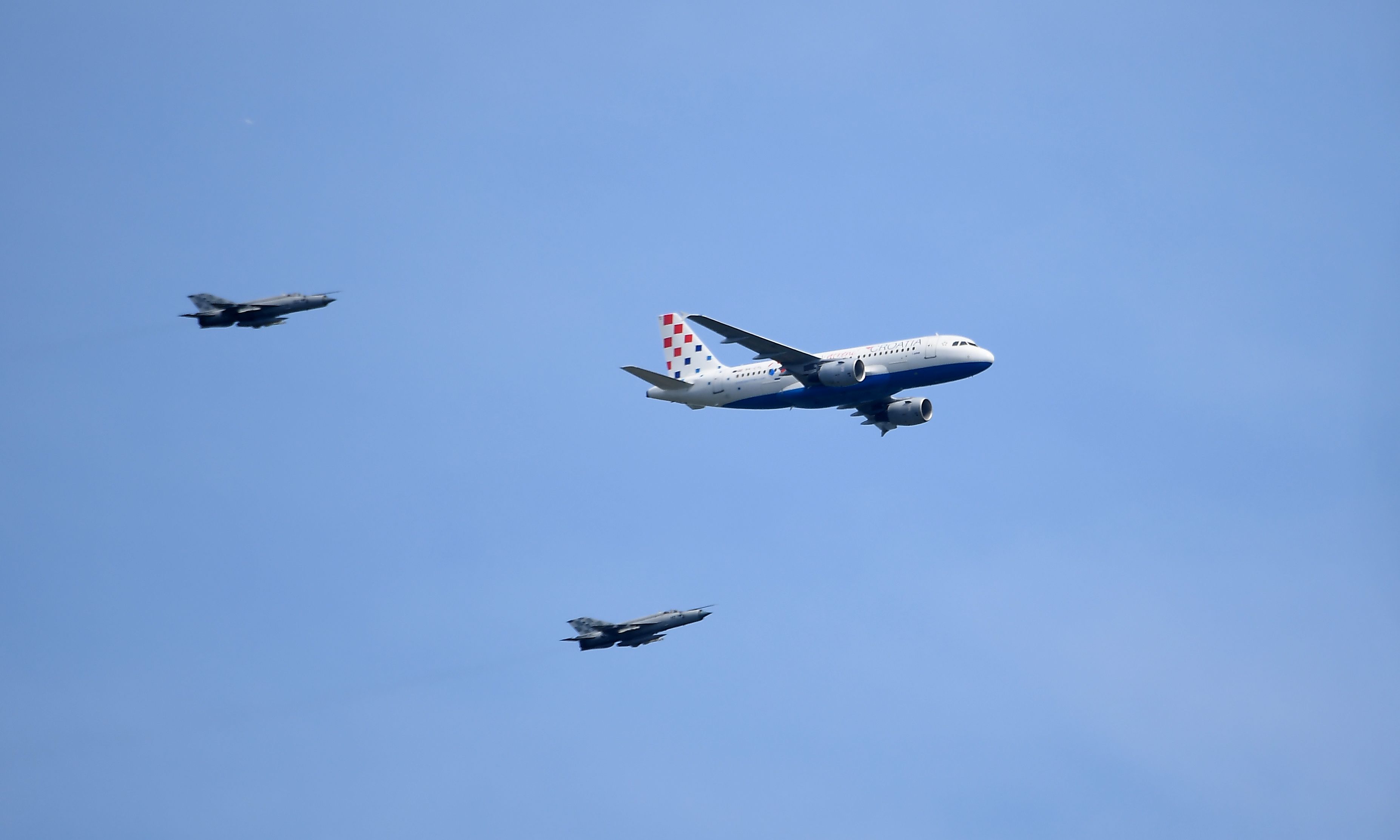 A helyszínen készített fotókon az is látszik, hogy a horvátok gépe nem akármilyen díszkíséretet kapott: vadászgépek kísérték el őket a leszállópályáig.