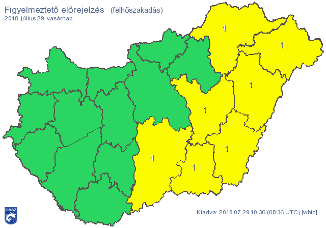 Felhőszakadás miatt veszélyjelzés adott ki hét megyére az Országos Meteorológiai Szolgálat. Napközben a Dunántúl keleti peremén és a Dunától keletre alakulhat ki elszórtan zivatar.