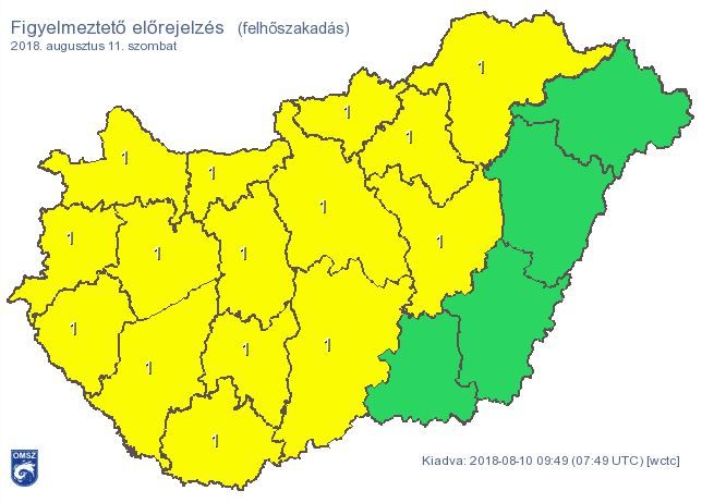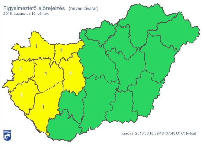 Péntekre heves zivatar és felhőszakadás miatt Fejér, Győr-Moson-Sopron, Komárom-Esztergom, Somogy, Vas, Veszprém ás Zala megyére adott ki elsőfokú, citromsárga figyelmeztetést az Országos Meteorológiai Szolgálat.