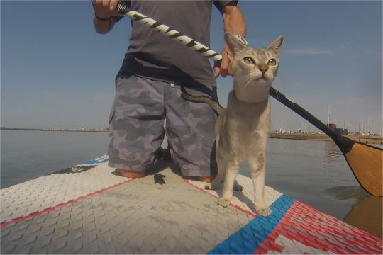 A legtöbb cicával ellentétben Noodle nem kap frászt a víz közelségétől, sőt: akár 5 kilométer hosszú túrákra is elkíséri gazdiját. Macskaként az egyensúlyozással nincs problémája, mindössze egyszer pottyant a deszkáról a vízbe, de ez sem vette el a kedvét.