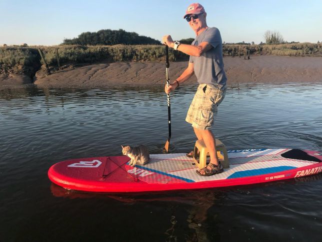 A 72 éves, nyugdíjas matektanár, Nigel Edmunds négy éve fedezte fel magának a SUP-os evezést, és azóta a sport megszállottja. Amire a 4 unokás nagypapa nem számított, hogy a cicája, Noodle is beleszeret majd a deszkába.