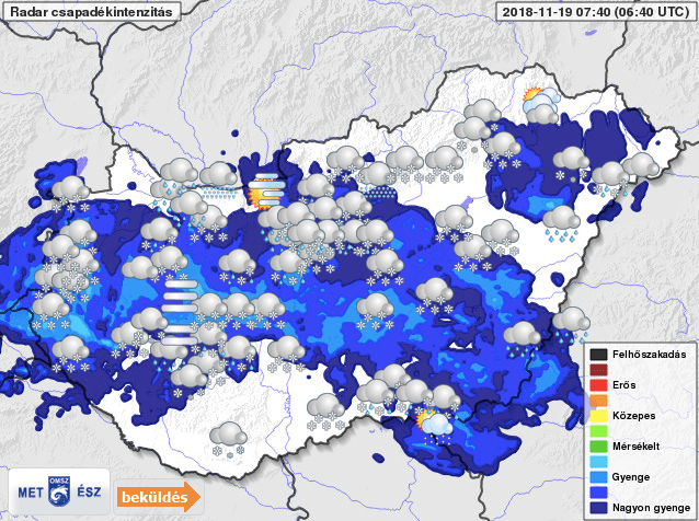 Az előrejelzés szerint kora délutánig többfelé várható vegyes halmazállapotú csapadék; eső, havas eső, hó egyaránt hullhat. Keleten döntően eső, a Nyugat-Dunántúlon inkább hószállingózás, gyenge havazás valószínű, majd délutántól egyre kevesebb helyen fordulhat elő csapadék.