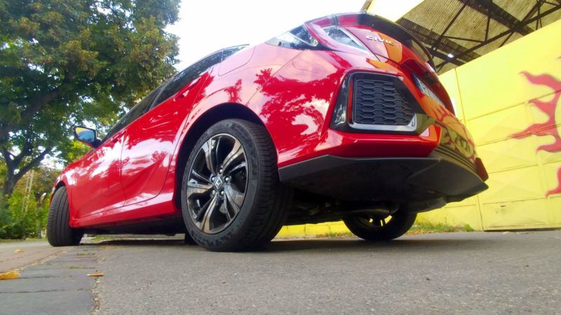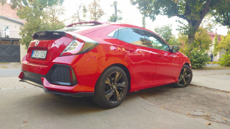 Így, a ködlámpáknak otthont adó állégbeömlőkkel együtt elképesztően agresszív hatást kelt, mintha egy telivér versenyautóval néznénk farkasszemet. Ez az autópályán is megmutatkozik, amint megjelent a piros-fekete „ábrázat” az előttünk haladók visszapillantó tükrében, úgy nyílt meg előttünk az út, mintha legalábbis attól tartanának, hogy a Honda Civic az út aszfaltborításával együtt tépi fel az útról a közlekedés más résztvevőit.