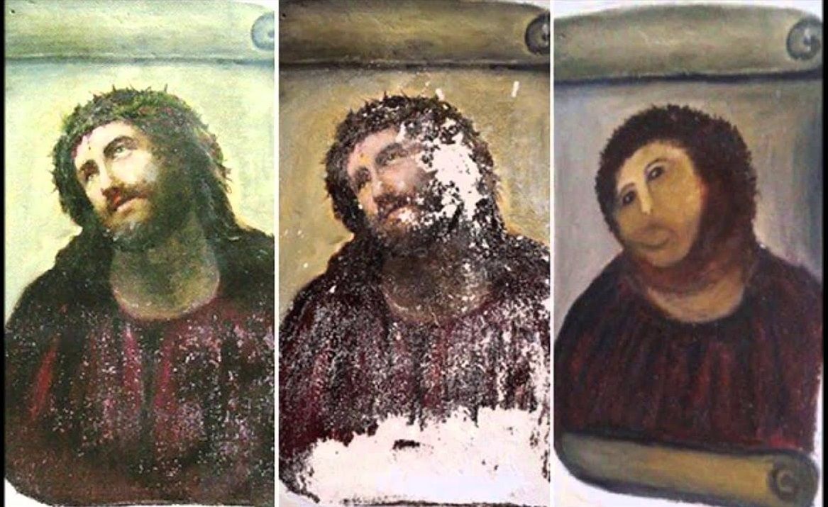 A spanyol Cecilia Giménez asszony hírhedt alkotása, a Moncsicsi Jézus (fotó: Youtube)
