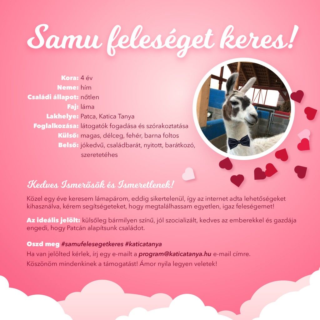 A jelöltekkel kapcsolatos megkereséseket a program@katicatanya.hu e-mail-címen várják. Akinek a közreműködésével sikerül megtalálni az arát, az lesz Samu tanúja a menyegzőn.