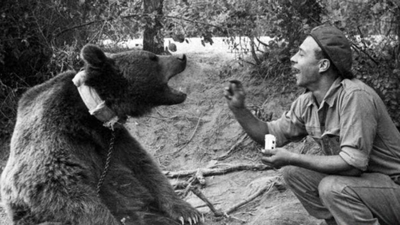 Wojtek épp az egyik katonával birkózik – a történet szerint kifejezetten barátságos állat volt, soha senkit nem bántott (Fotó: Wikipedia)