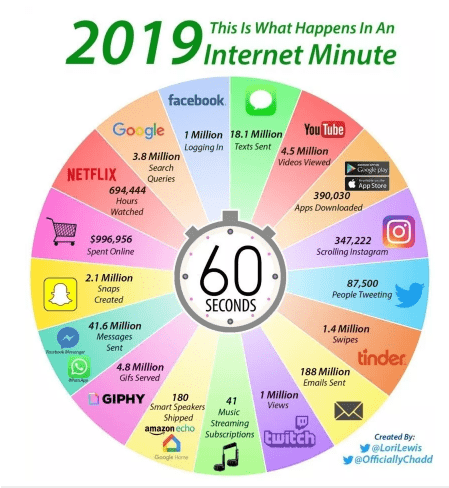 3,8 millió Google-keresés, 41,6 millió elküldött Messenger-üzenet: néhány dolog, amihez 2019-ben mindössze egy percre van szükség az interneten. Az a bizonyos hatvan másodperc, ami egy átlagos munkanapon semmiségnek tűnik, és legfeljebb arra elég, hogy néhány szóban válaszolj egy relatíve sürgős e-mailre, az interneten valódi kincs, ami alatt – szó szerint – kismillió dolog történhet, és rendszerint történik is.