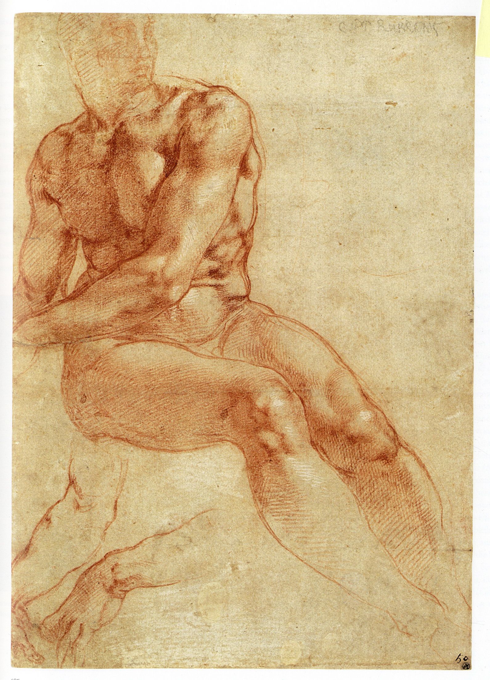 Ahogy azt az alcím (Michelangelo és a 16. századi itáliai rajzművészet) is jelzi, a kiállítás egyik nem titkolt célja, hogy bemutassa, miként illeszkedik (vagy nem illeszkedik) Michelangelo munkássága az érett reneszánsz képzőművészetének szövetébe, így a falakon számos neves, vagy éppen mára teljesen elfelejtett kortársa, követője és riválisa is helyet kapott; Leonardo és Raffaello mellet olyanok, mint Luca Signorelli, Agnolo Bronzino, Rosso Fiorentino, Francesco Salviati vagy Jacopo Pontormo. Az ő műveik egyrészt kontextusba helyezik, másrészt izgalmasan ellenpontozzák vagy kiegészítik Michelangelo anatómiailag precíz, virtuóz rajzait. Nyilván a tárlat elrendezése erre még rá is erősít, de ettől függetlenül is könnyen támadhat az a benyomásunk (ami talán nem is áll olyan messze a valóságtól), hogy a korabeli itáliai alkotók nagy része Michelangelóhoz, illetve a jó húsz évvel idősebb Leonardóhoz képest határozta meg magát; vagy szemérmetlenül másolták mesterfogásaikat, vagy éppen megpróbáltak valami gyökeresen mást csinálni (ami aztán vagy sikerült, vagy nem).
