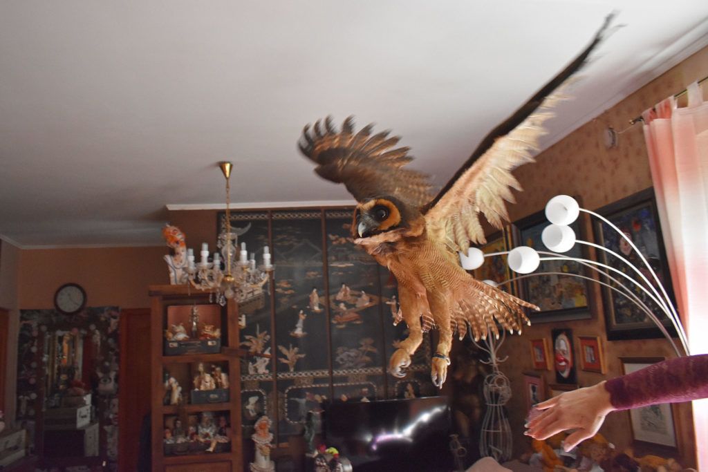 „Sophie, gyere csak ide a kezemre! Mutasd meg, milyen okos vagy!” Miközben beszélgetünk, Annamária egyszer csak odalép Sophie éppen aktuális őrhelyéhez, és megpróbálja a kezére venni a madarat. És Sophie jön is, szavak se nagyon kellenek ahhoz, hogy pontosan értse, mit szeretne a gazdi: egy ideig élvezi Annamária közelségét, a simogatást, aztán mégis úgy dönt, jobb az úgy, ha inkább elvonul a szoba túlsó, biztonságosabb végébe, és ott várja ki a történéseket. „Nincs még egy ilyen barátságos, kedves és kreatív bagoly, mint ő” – néz a madár után Annamária, aztán teljesen váratlanul kibukik belőle, hogy a sok jó ellenére Sophie-tól bizony egyáltalán nem áll távol, hogy olykor szándékosan törjön borsot az orra alá.