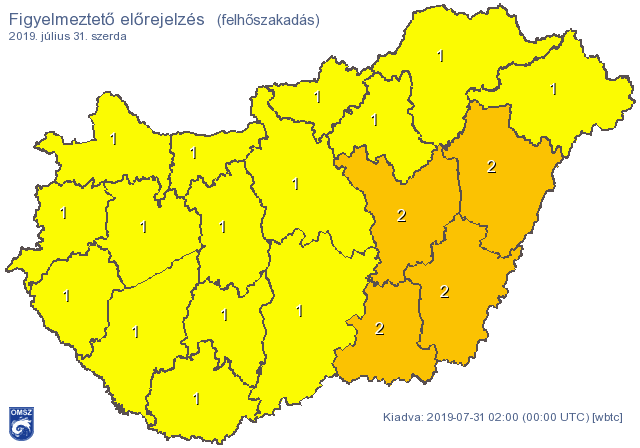 Figyelmeztetést adott ki a meteorológia szerdára felhőszakadás és zivatar valószínűsége miatt az egész ország területére. Szerda délelőtt elsősorban az ország délnyugati részén lehetnek zivatarok jelentősebb mennyiségű csapadékkal.