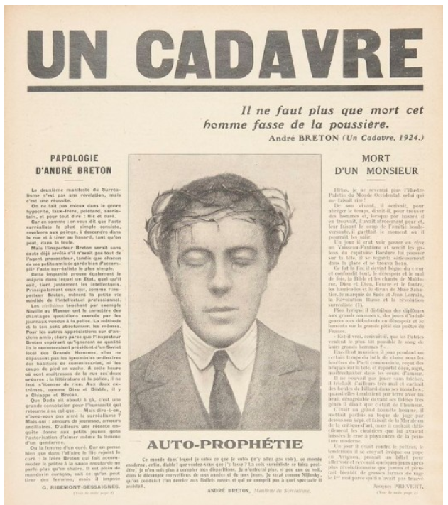 A rendkívül szórakoztató szövegből más egyebek mellett azt is megtudhatjuk, hogy Limbour egy irodalmi kurva, Baron szégyentelenül nyúlja Apollinaire-t és nincs egy eredeti ötlete sem, Robert Desnos meg épp ellenkezőleg, túlságosan egyénieskedő, nem eléggé elkötelezett politikailag, kubai kiruccanása alkalmával pedig nem átallott Racine-t szavalni, és így tovább. Breton a nagy elődöket sem kímélte: véleménye szerint Rimbaud át akar verni minket, Poe-t le kell köpni, Alfred de Vigny meg teljesen hülye – valamiért egyedül csak szegény Lautréamont-nak kegyelmezett meg (persze, ezt az egészet pont annyira kell komolyan venni, mint a Clash-t, amikor a múlttal való végleges leszámolás jegyében azt énekelte, hogy no Elvis, Beatles, or The Rolling Stones in 1977). Természetesen a válaszcsapás sem késett sokáig. Az ellen-szürrealisták egyrészt új folyóiratot alapítottak (ez volt a Documents), másrészt pedig kiadták a Breton töviskoronás fotójával ékesített Egy hulla című pamfletet, amelyet teljes egészében a volt szürrealistapápa lejáratásának szenteltek. Hiába, akkoriban még vérre ment a művészet!