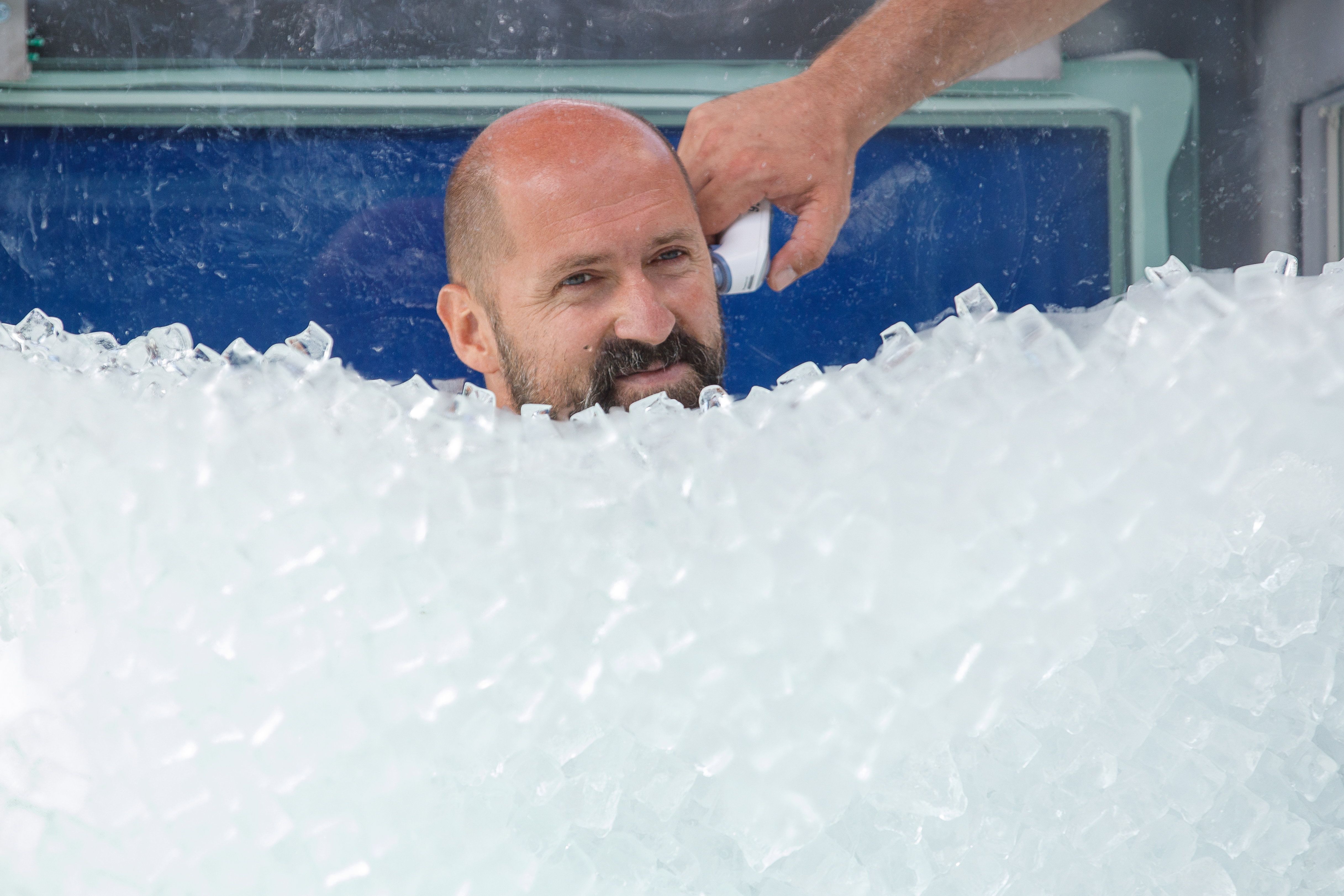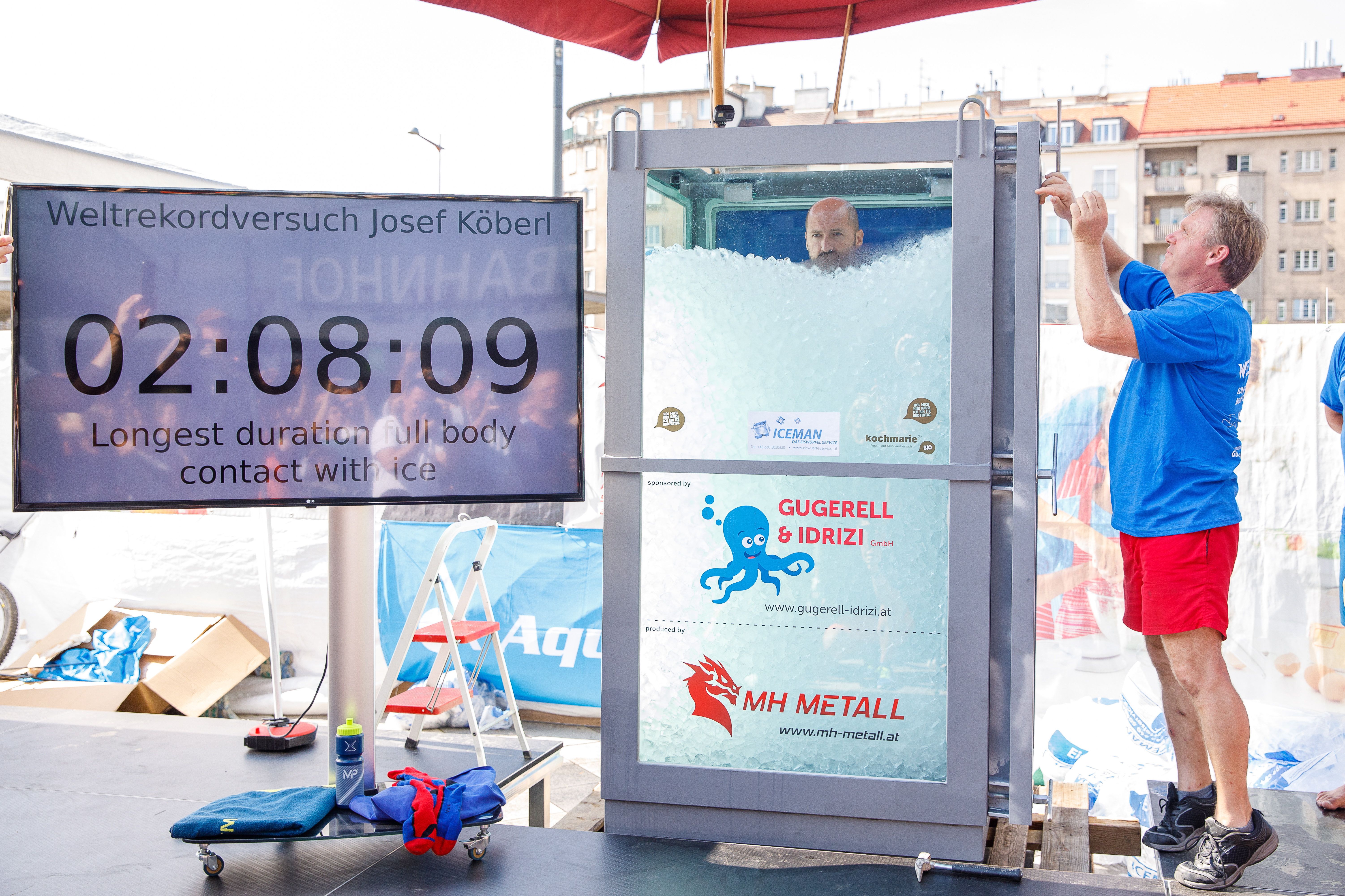 A téli jeges vizekben való úszásáról közismert, állóképességét a végletekig próbálgató férfi a bécsi főpályaudvar előtt szombaton felállított mintegy két méter magas üvegkabinba fürdőnadrágban állt be. Ezután a segítői feltöltötték jégkockákkal az átlátszó kabint, a jég a férfi álláig ért.