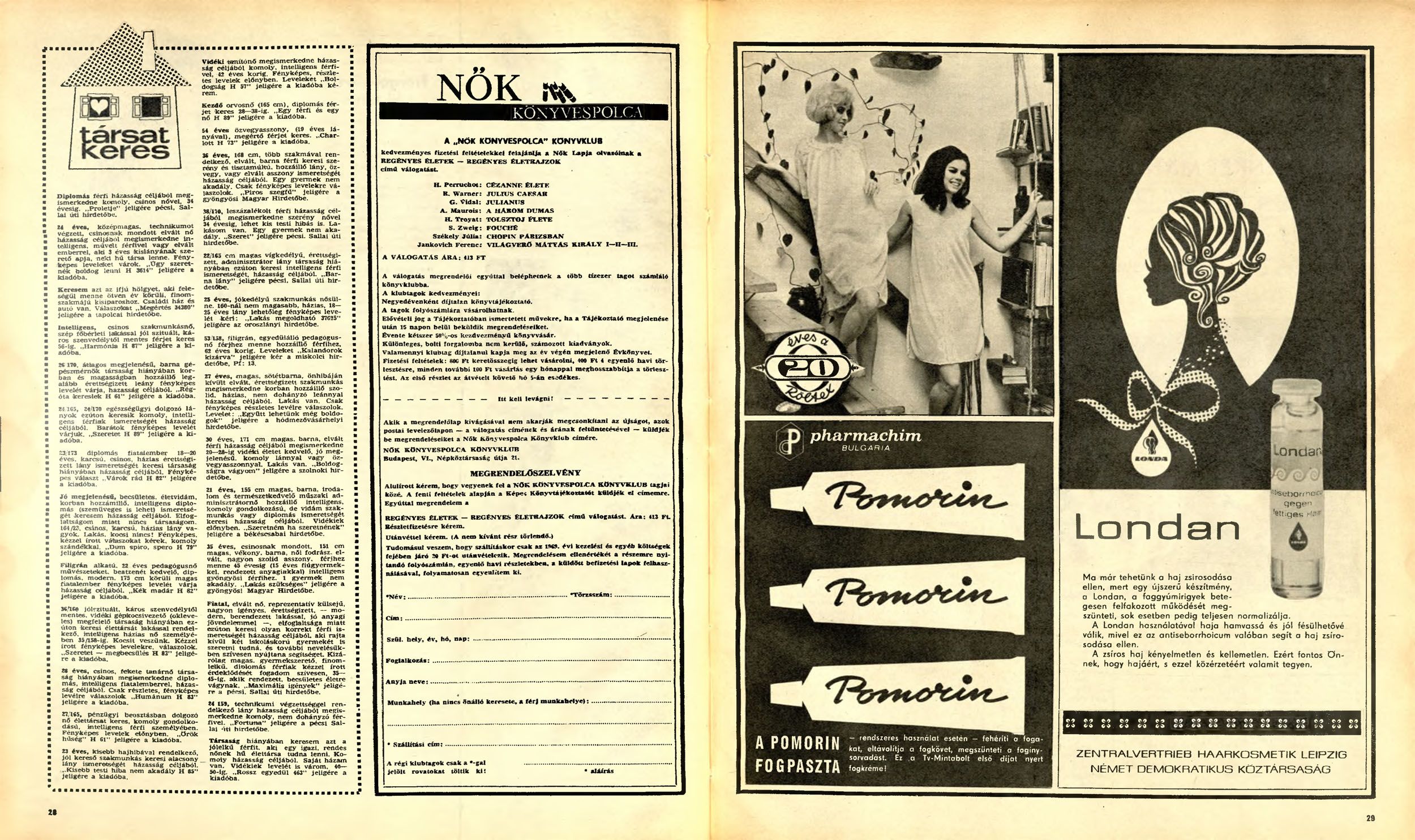 És egy Pomorin-reklám mellett egy másik legenda, aminek párok, családok köszönhetik a létüket: a Nők Lapja társkereső rovata. Nahát, amikor még képek nélkül kellett dönteni… így kapott csak igazán értelmet az aztán évtizedekig ki nem kopó „csinosnak mondott” fordulat. Itt még senki nem szégyelli leírni, hogy házasság céljából ismerkedne. „Filigrán alkatú, 22 éves pedagógusnő művészeteket, beatzenét kedvelő, diplomás, modern, 175 cm körüli magas fiatalember fényképes levelét várja házasság céljából »Kék madár« jeligére.” Vajon lett belőle házasság? A pedagógusnő mindenesetre már hetvenegy éves, ha minden jól ment.