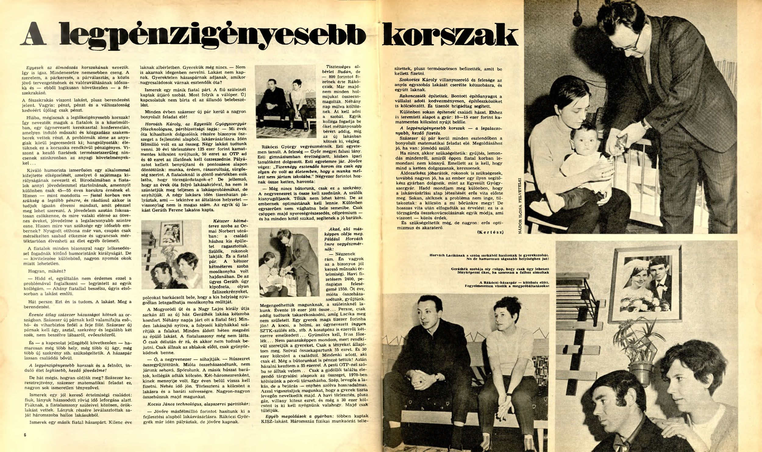 Úgy látszik, a társadalmi alapproblémák valóban nem változnak. Érdekes ellentmondásra figyelt fel az újságíró: az embereknek életük során akkor lenne a legnagyobb szükségük tőkére, amikor a legkevesebbet keresnek. Vagyis a családalapítás időszakában. Kiderül, hogy egy albérlet 800 forintba kerül, egy saját lakáshoz pedig legalább 40 ezret kell összegyűjteni, persze a vállalati támogatás mellett. Merthogy az Egyesült Gyógyszergyár például négy lakást is vásárol, amiket kiutal az arra érdemes törzsgárdatagoknak – számol be róla egy pártbizottsági tag. Akkor még nem tudják, de cirka harminc év múlva a társadalmi evolúció talál egyfajta megoldást: az első szülés időpontja mind későbbre és későbbre tolódik…