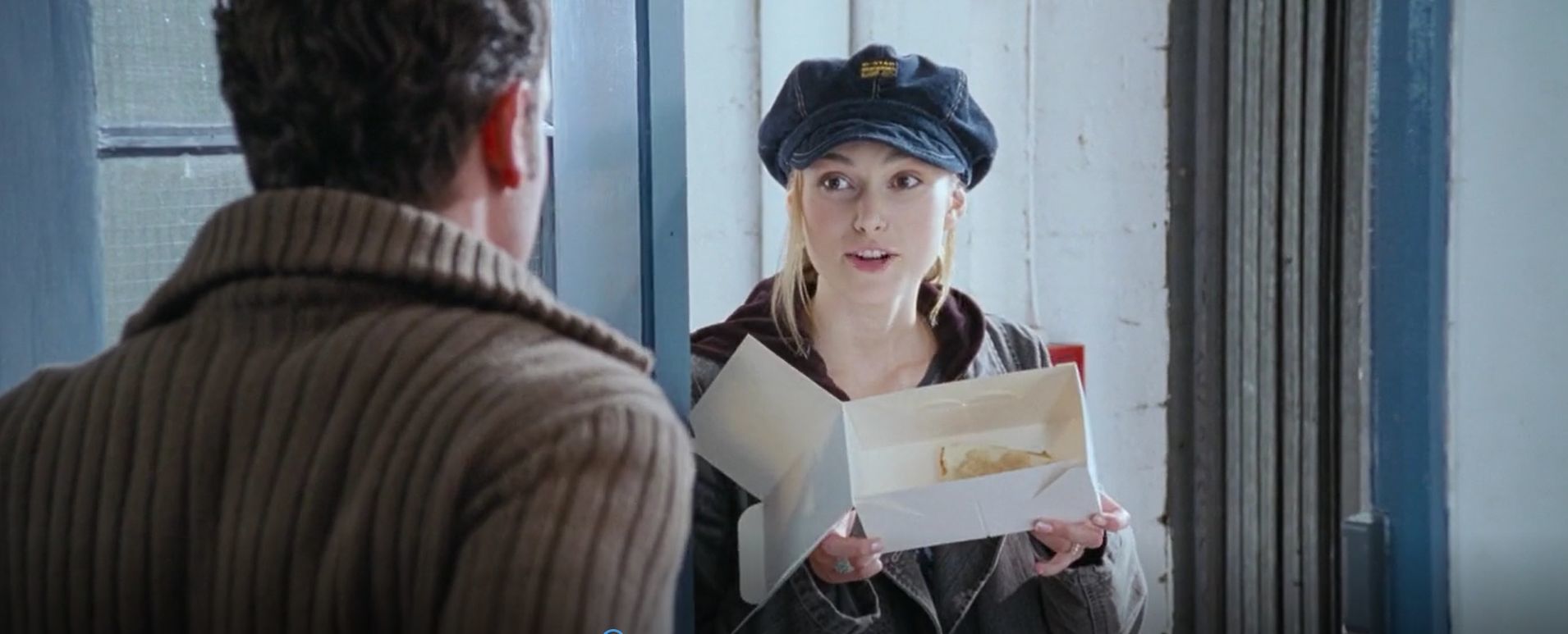 Keira Knightley egy nem túl előnyös, méretes sapkában állít be Andrew Lincolnhoz. A ruhadarab nem a jelmeztervező heppje volt, hanem kényszer. Az akkor 18 éves színésznő homlokán ugyanis aznap reggelre egy akkora pattanás nőtt (a színésznő egy évekkel későbbi interjúban második fejnek nevezte), hogy azt semmilyen sminkes trükkel nem lehetett eltüntetni. Az egyetlen megoldás ez az ormótlan, mindent eltakaró sapka volt.
