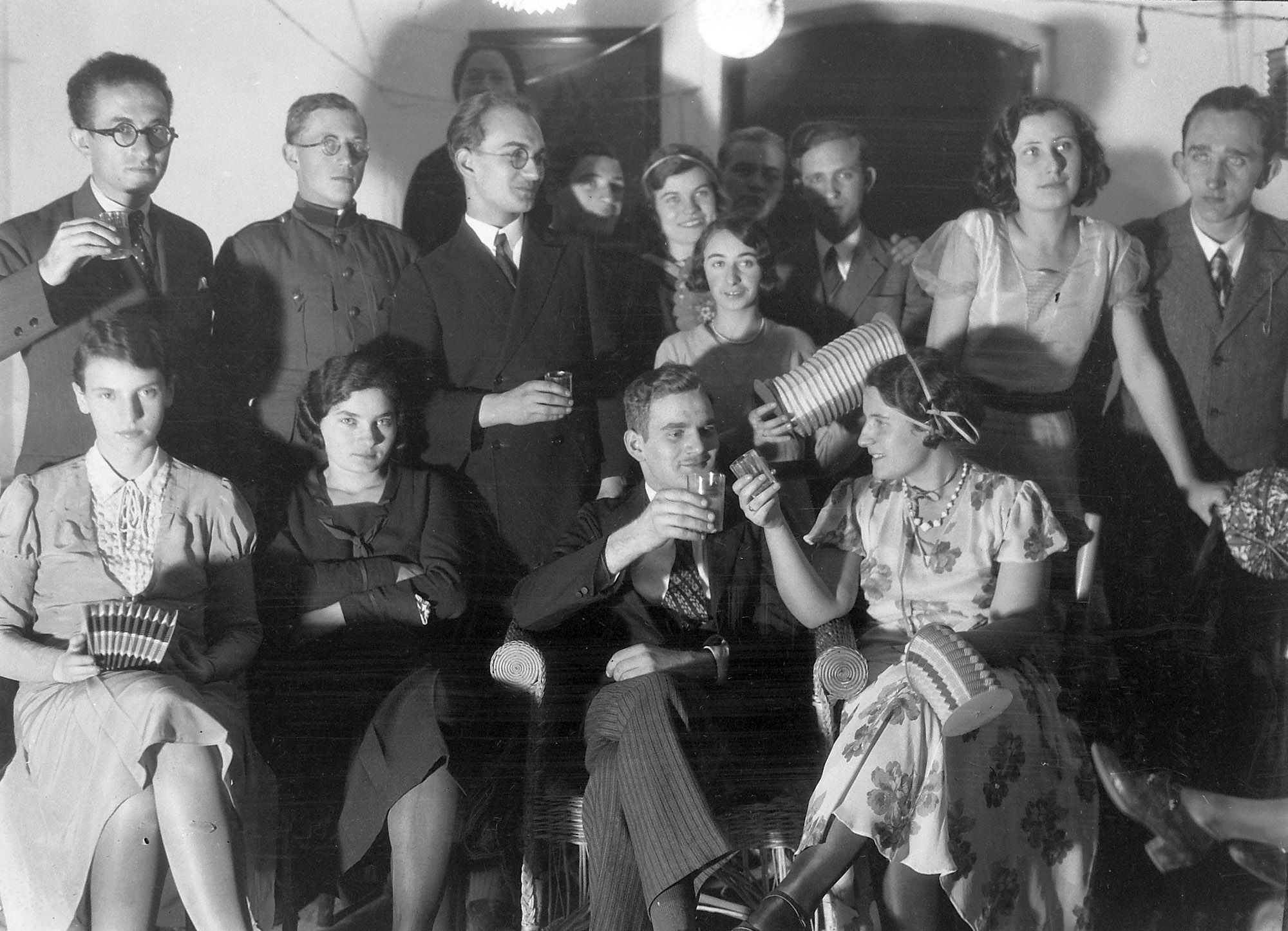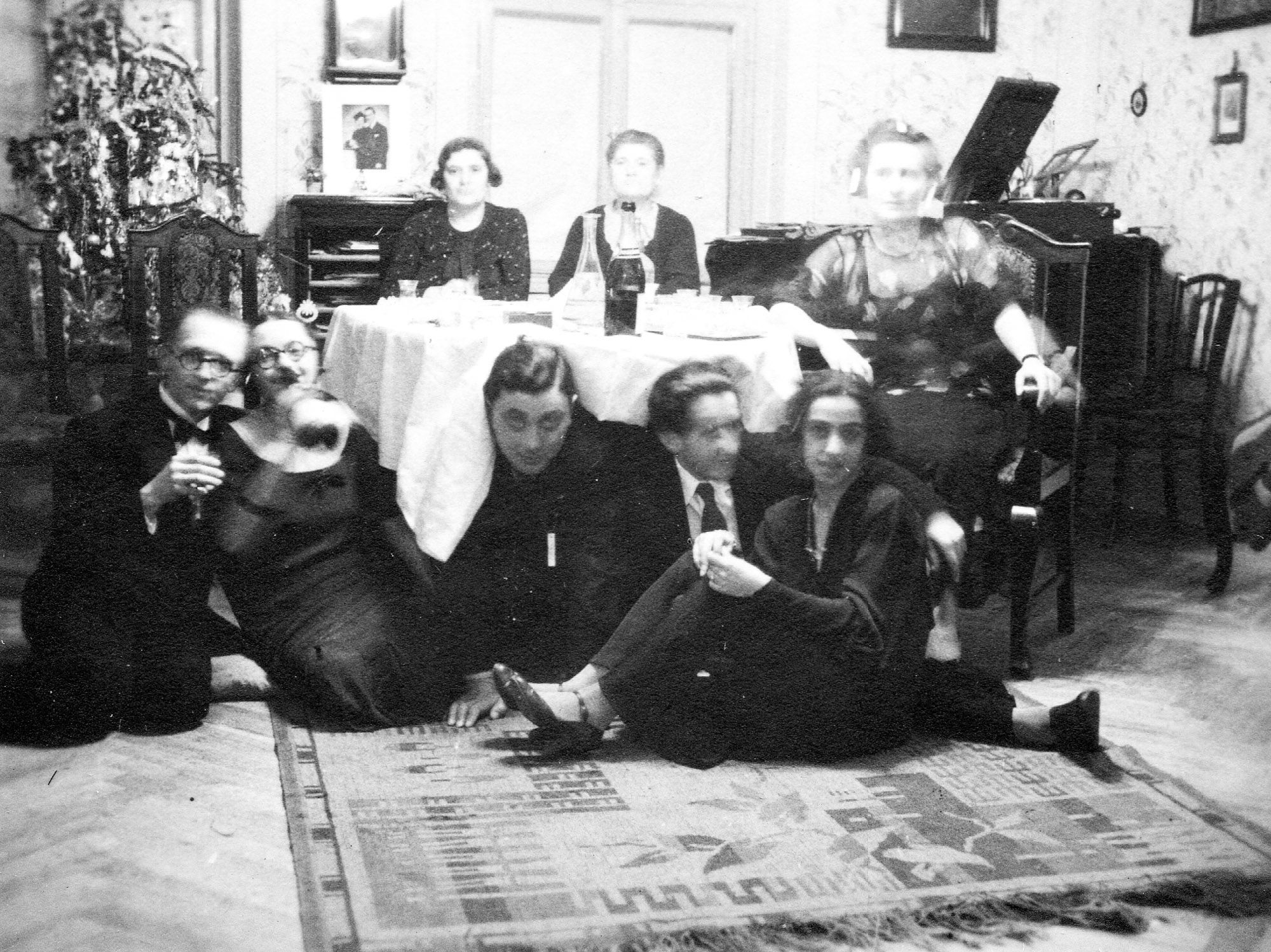 Szilveszter Németh László író lakásán. Balra Illyés Gyula, jobbra Déry Tibor írók, Déry mögött Illyés Gyuláné Kozmutza Flóra, mögötte Gombos Katalin színművésznő.