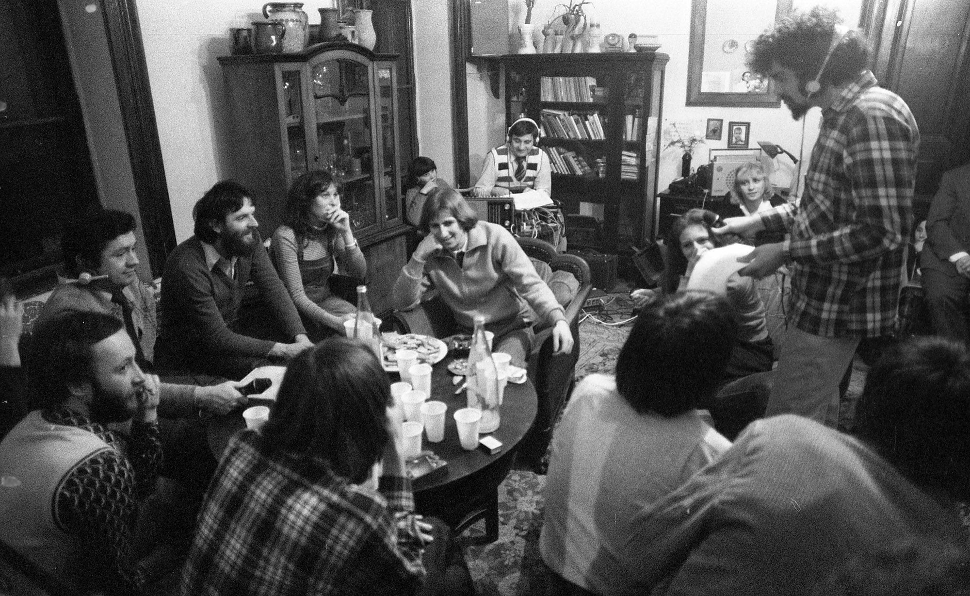 A Magyar Rádió közvetítése egy belvárosi lakásból szilveszterkor. Az asztalnál balra hátracsúszott fejhallgatóval Feyér Zoltán szerkesztő-riporter, tőle jobbra a harmadik Jolsvai András szerkesztő, író, újságíró.