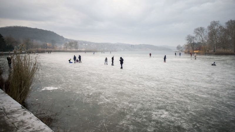 Korcsolyázók a befagyott Pécsi-tavon Orfűn 2020. január 4-én (Fotó: MTI / Sóki Tamás)