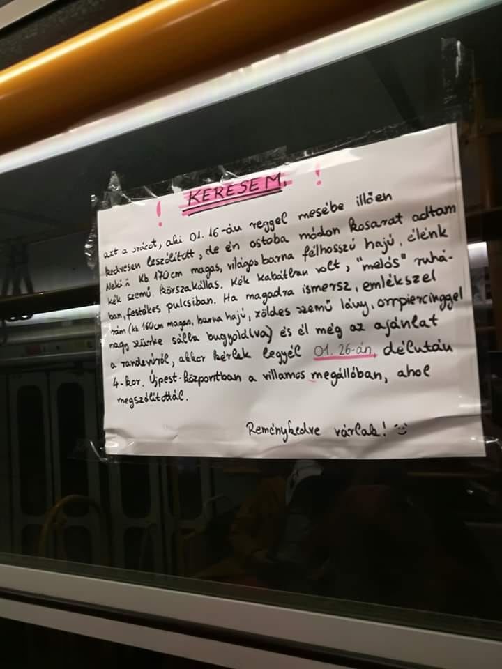 Cuki üzenet jelent meg az egyik budapesti villamos ablakába ragasztva: egy lány keresi azt a fiút, aki pár napja leszólította, de ő kosarat adott neki.