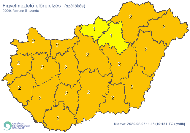 Szerdán sem enyhül a szél, sőt tovább durvul a helyzet: a heves széllökések miatt másodfokú figyelmeztetést adtak ki az összes megyére, egyedül Nógrád és Heves megyében elsőfokú a jelzés.