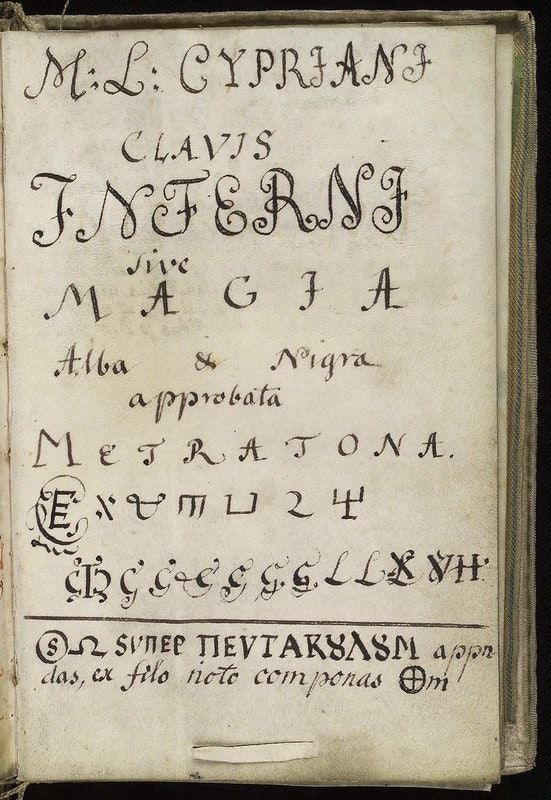 - Némelyek szerint Ciprián azonos egy, az i.sz. III. században, azaz a keresztényüldözések idején Antiokhiában élt vértanú püspökkel, bizonyos Szent Cyprianusszal, aki megtérése előtt állítólag még nyakig benne volt a tiltott tudományokban (sőt: még későbbi mártírtársát, a keresztény Iustinát is mágia segítségével próbálta elcsábítani, természetesen sikertelenül). A Cipriánnak tulajdonított állítólagos varázskönyvek nagyjából a 15. századtól kezdve már komoly kultusznak örvendtek a portugál, spanyol, francia és különösen a skandináv területeken, noha birtoklásuk vagy a bennük foglalt varázsigék és egyéb sötét praktikák használata nem volt éppen veszélytelen, ugyanis az inkvizíció mindig éberen figyelt.