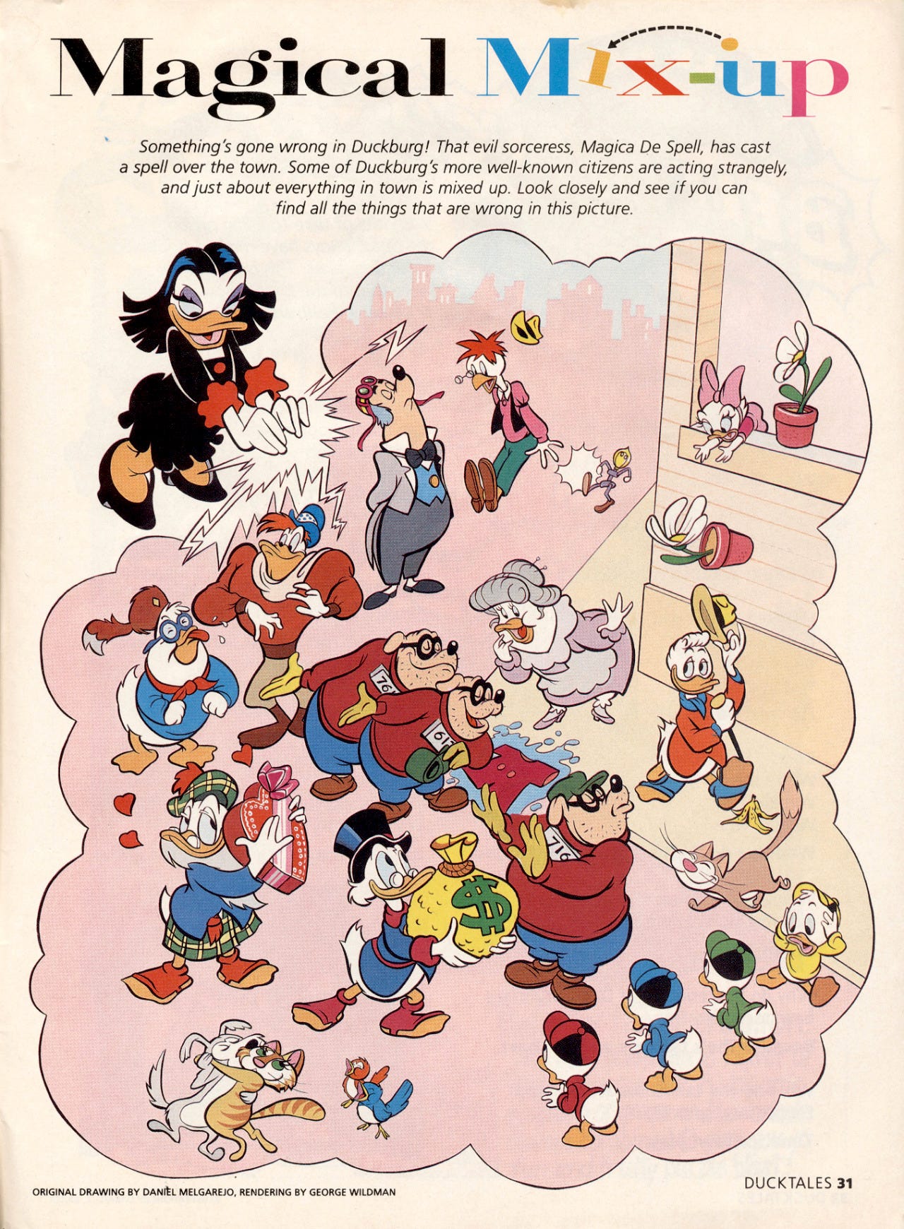 - 1989-ben meg a brit DuckTales Magazine egyik hibakereső fejtörőjében. Ugyan az ábrázolás itt szándékosan heterodox, annyiban mégiscsak fontos, hogy a negyedik testvér ekkor viselt először sárga öltözéket, amely később aztán kanonizálódott