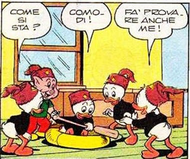 Bár elég aprócskák, azt azért nem nehéz kiszúrni, hogy a képen négy kiskacsa látható. Amiből az egyik persze csak véletlenül került oda: a rajzoló – Carl Barks – bizonyára kissé elbambult, hát van ilyen, attól még nem dől össze a Donald-univerzum.