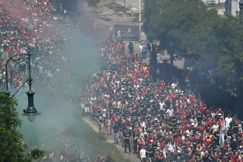 A magyar labdarúgó-válogatott – a portugálok elleni 3-0-s vereség után – ma 15 órakor találkozik az első fordulóban a németeket 1-0-ra felülmúló, vb-címvédő franciákkal a Puskás Arénában. Máthé Zoltán, az MTI fotóriportere megörökítette, ahogy óriási tömegben vonulnak a magyar szurkolók a Puskás Arénához a Dózsa György úton.